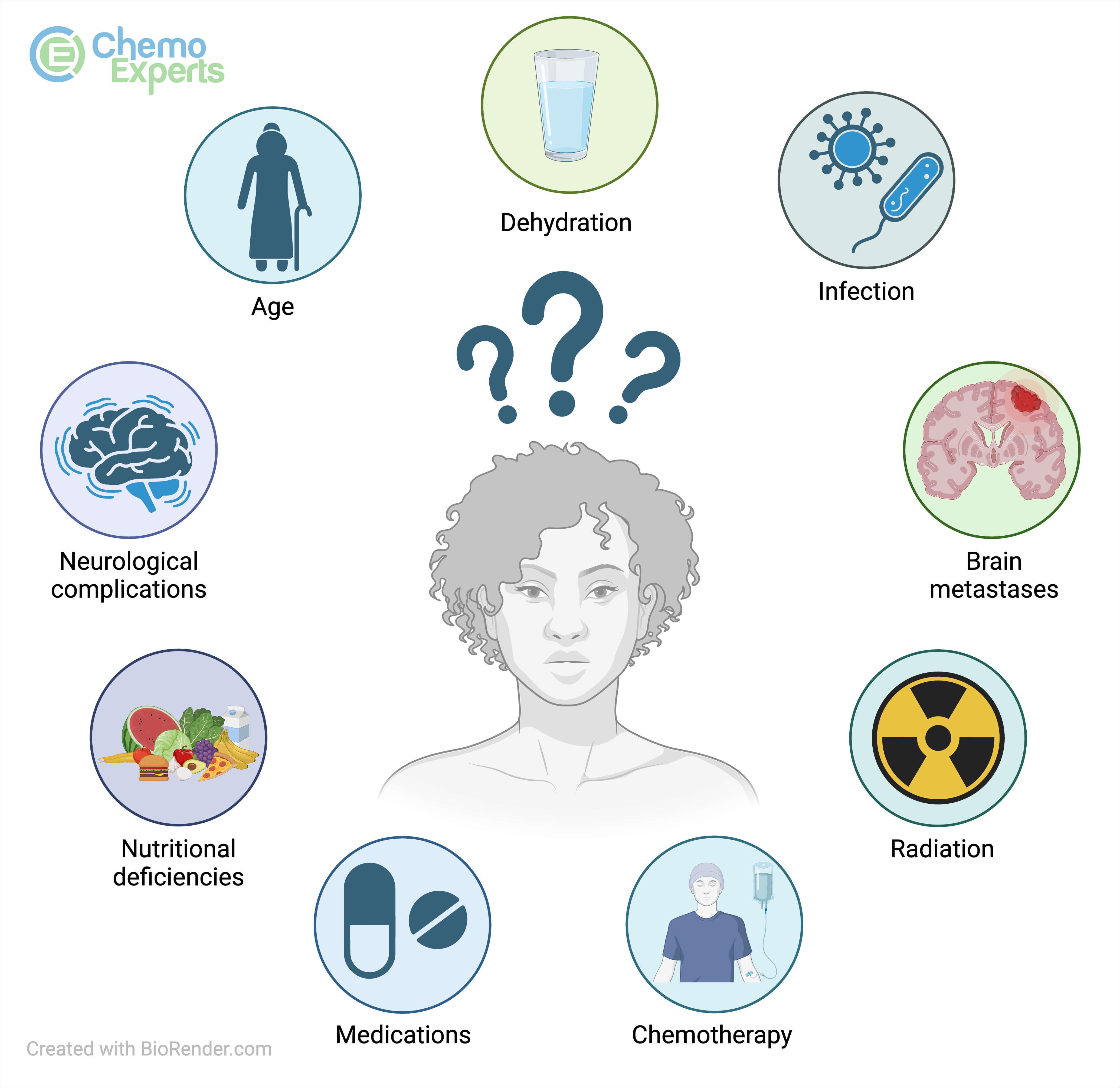 Patients with cancer can experience confusion or altered consciousness, particularly in advanced stages of the disease or during treatment. The causes of confusion or altered consciousness in patients with cancer can vary, and may be due to various factors, including age, dehydration, medications, chemotherapy, radiation, infection, nutritional deficiencies, metabolic imbalances, brain metastases, and neurological complications.