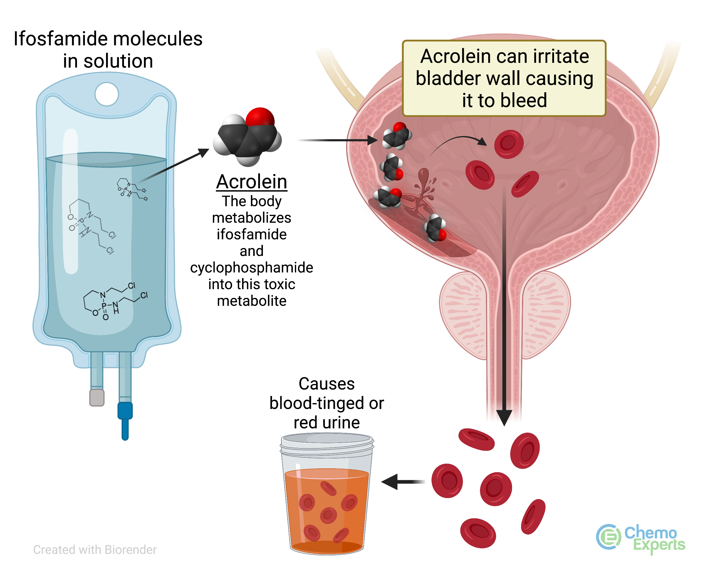 Certain types of medications can increase the risk of hemorrhagic cystis. The most common being ifosfamide. A similar chemotherapy agent know as cyclophosphamide rarely leads to blood in the urine when given intravenously.