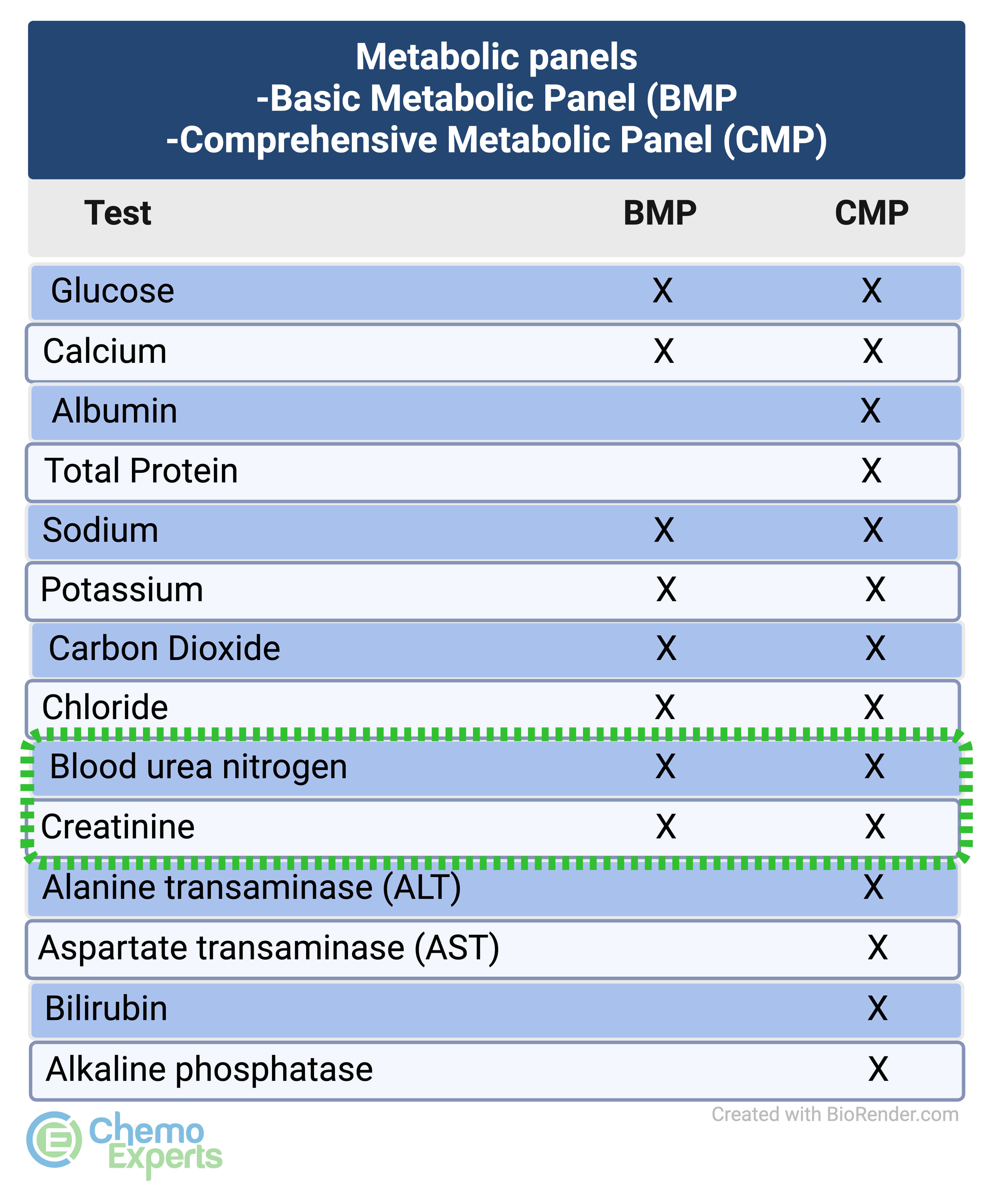 Although you cannot look at someone and see if their kidneys are working, an elevated BUN or SCr levels can indicate that the kidneys are not functioning properly. Thankfully, both of these tests can be performed together in either a basic metabolic panel (BMP) or comprehensive metabolic panel (CMP) blood test, which are routine screening tests that measures a variety of different substances in the blood.