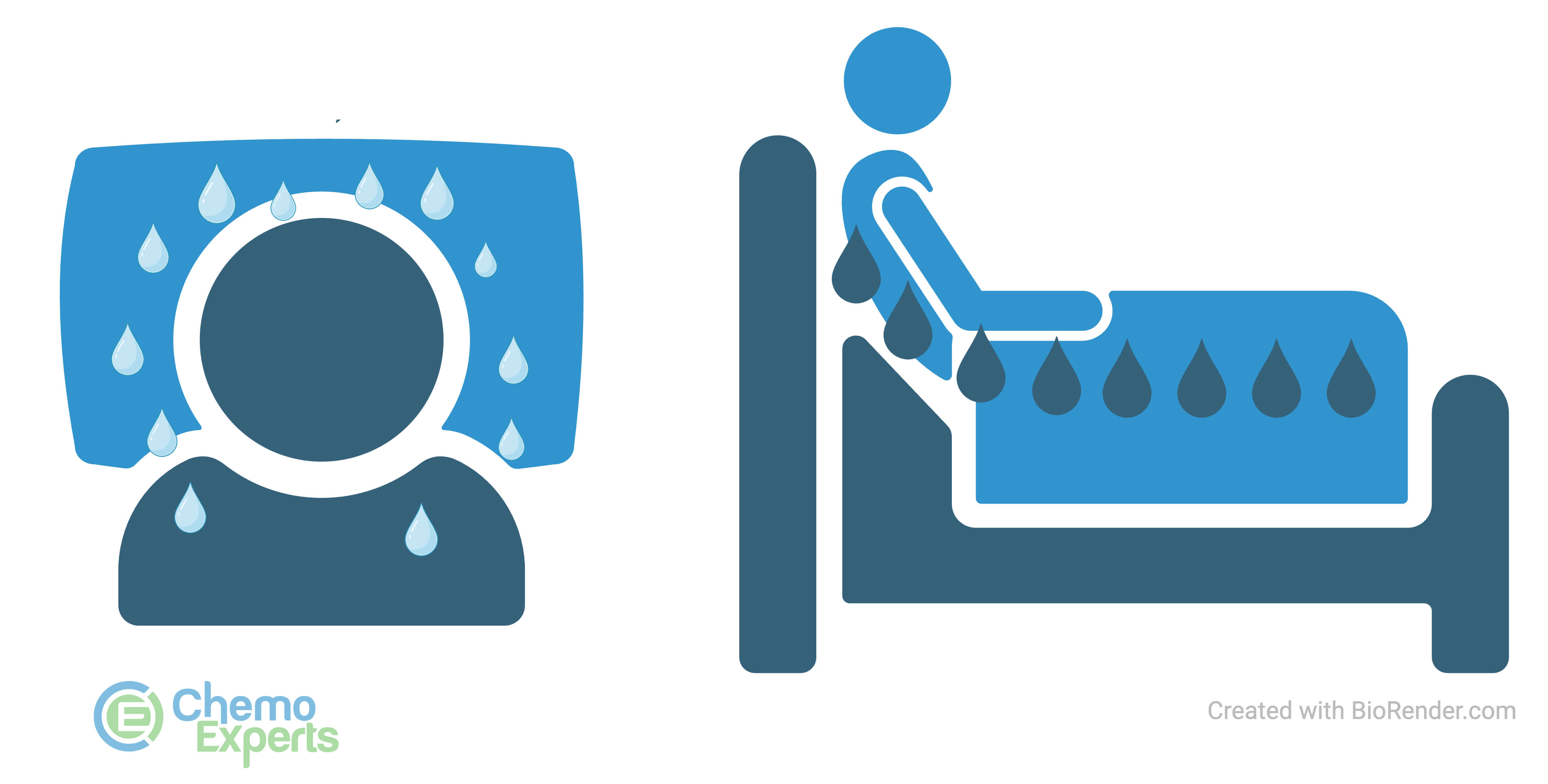 Night sweats refer to excessive sweating during sleep that soaks through bed sheets and can cause discomfort and interruption of sleep. Night sweats can be a symptom of certain types of cancer (such as lymphoma), or they can be a side effect of certain cancer therapies.